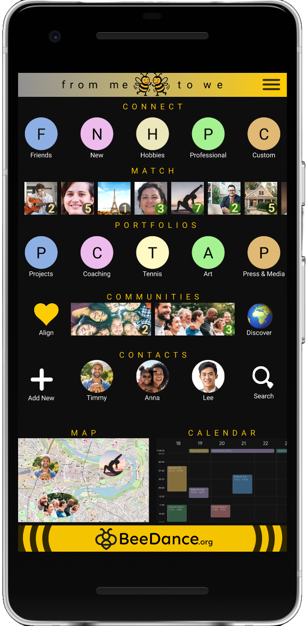 The BeeDance Map shows you not only which peers are in your location, but also where your best matching future Tennis partner, Yoga class, trekking community, business meet-up and concert are. See all events relevant to your liking both in the map as well as in the BeeDance Calendar.
